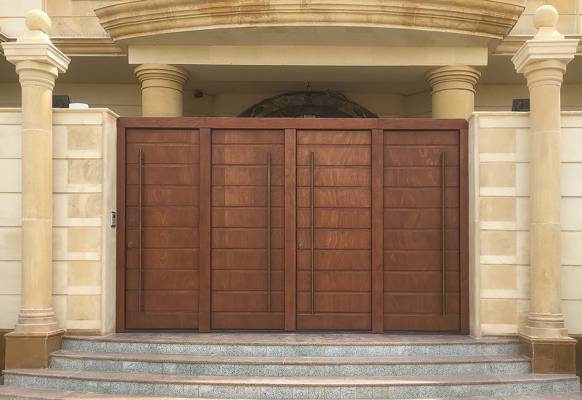 An impressive 4-leaf main gate for a residence in Jeddah. Oversized hinged doors in plywood marine, suitable for all weather conditions. Simply sublime and majestic!